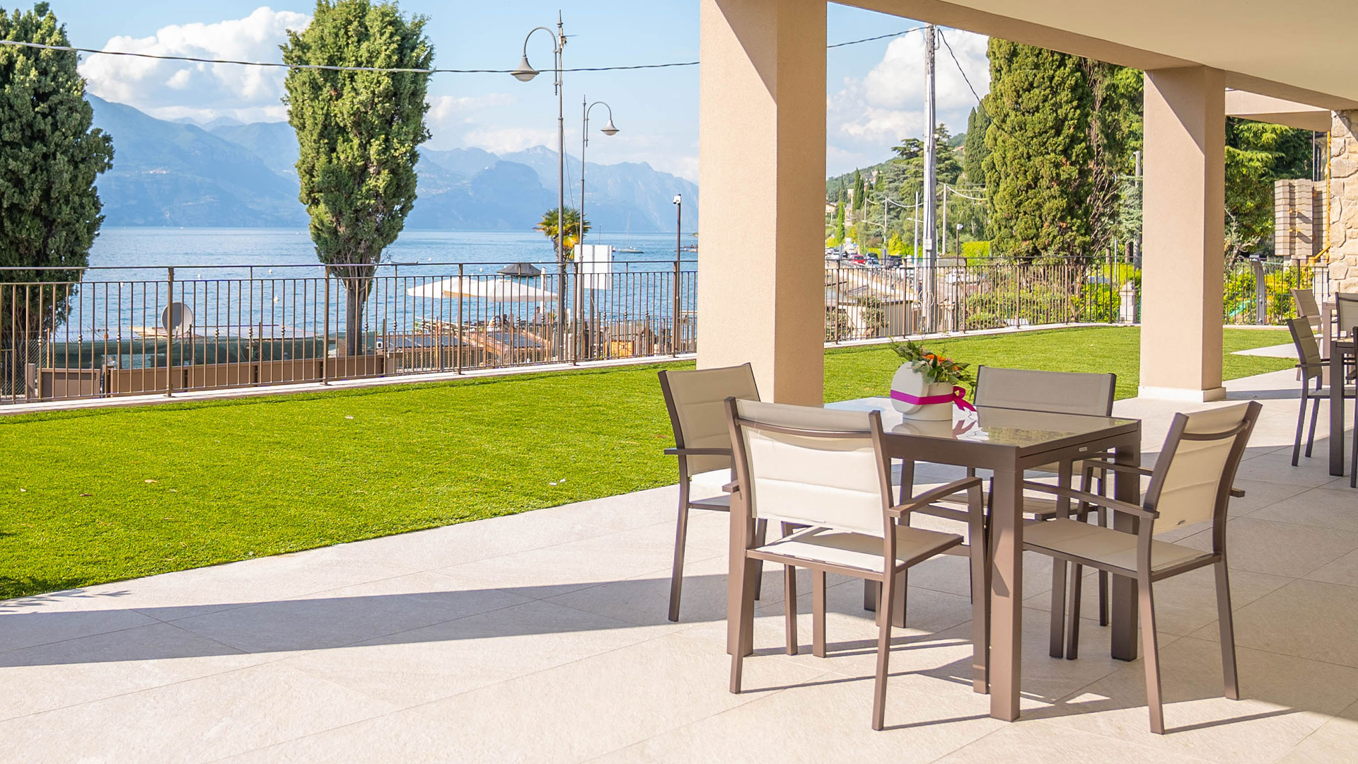 Il grande balcone con vista sul Lago di Garda è perfetto per pranzi all’aperto e momenti di relax.