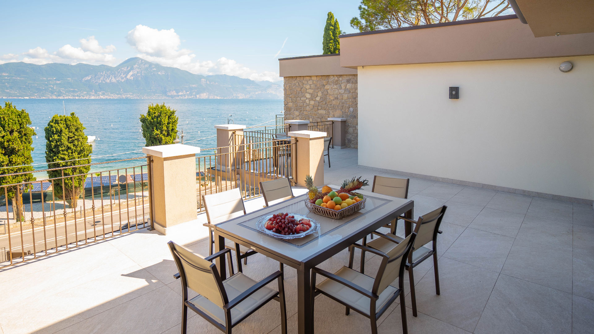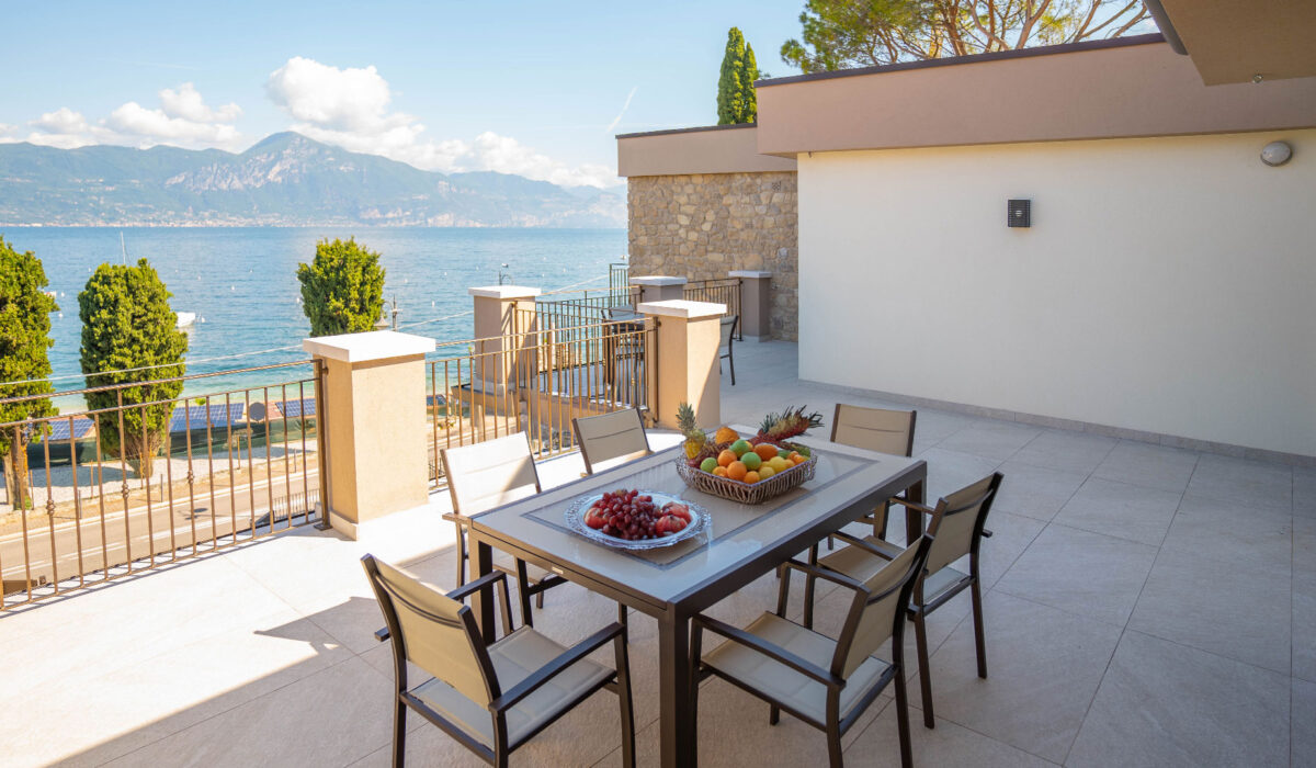 Il grande balcone con vista sul Lago di Garda è perfetto per pranzi all’aperto e momenti di relax.