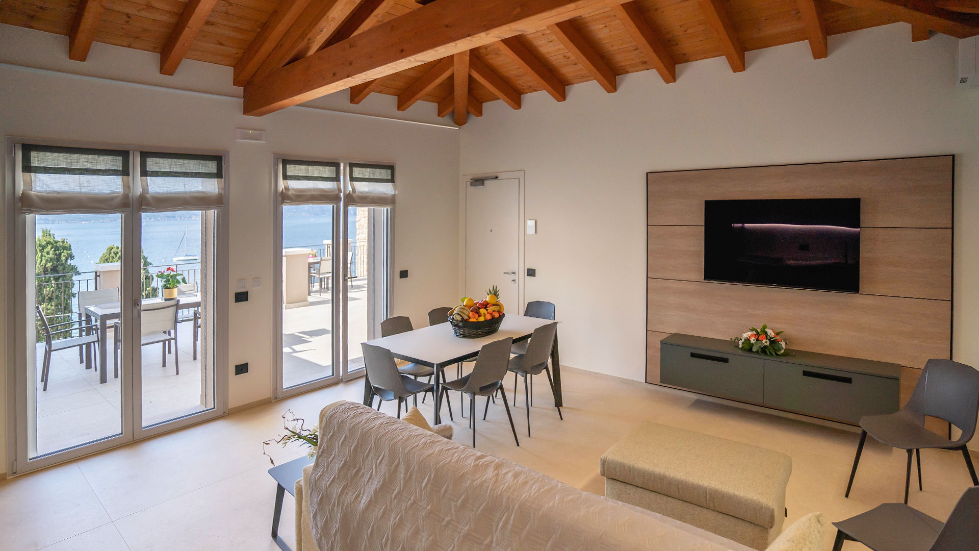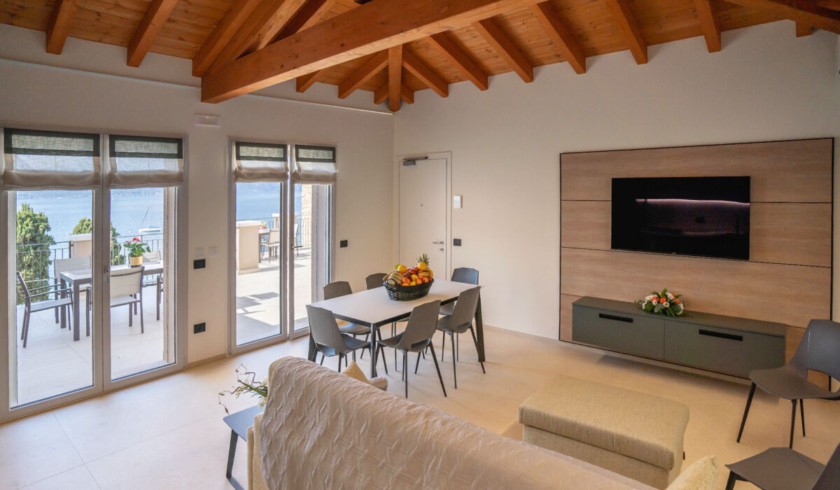Il grande balcone attrezzato con vista panoramica sul Lago di Garda permette di godersi cene all’aperto e momenti di relax immersi in un panorama da sogno.